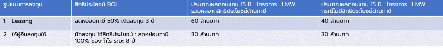 อย่างไรก็ดี ยังมีรูปแบบการลงทุนของโครงการโซลาร์อีกแบบ นั่นก็คือ leasing ที่ตอบสนองเป้าหมายของบริษัทฯ ได้เช่นเดียวกัน โดยไม่ต้องลงทุนเลย (หรืออาจลงทุนเพียงเล็กน้อย 20% ของโครงการ) แต่สามารถขอสิทธิประโยชน์ของภาครัฐผ่าน BOI ได้ ทำให้เร่งผลตอบแทนการลงทุนได้ขึ้นไปอีก ดังแสดงตามตารางด้านล่าง (อย่างไรก็ดีถึงแม้ว่าไม่ได้สิทธิประโยชน์ BOI แต่รูปแบบ leasing ก็ให้ผลตอบแทนมากกว่ารูปแบบสัญญาซื้อขายไฟฟ้า : หากจะคิดง่ายๆ การที่เรามีนักลงทุนเพิ่มขึ้นมา นักลงทุนก็ต้องการผลตอบแทนการลงทุน ส่วนต่างผลตอบแทนที่ได้ของรูปแบบการลงทุน ก็คือผลตอบแทนให้กับนักลงทุนนั่นเอง)