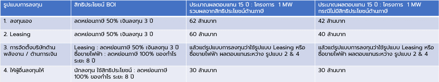 นอกจากนี้ยังมีตัวแปรที่สำคัญคือสิทธิประโยชน์ของภาครัฐ ผ่าน BOI ที่เป็นตัวเร่งผลตอบแทนการลงทุนและช่วยสนับสนุนการลงทุนให้กับนักลงทุนได้